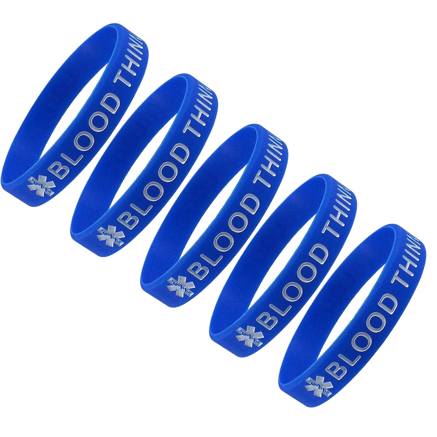 "BLOOD THINNER" Medical Alert ID Silicone Bracelet Wristbands 5 Pack