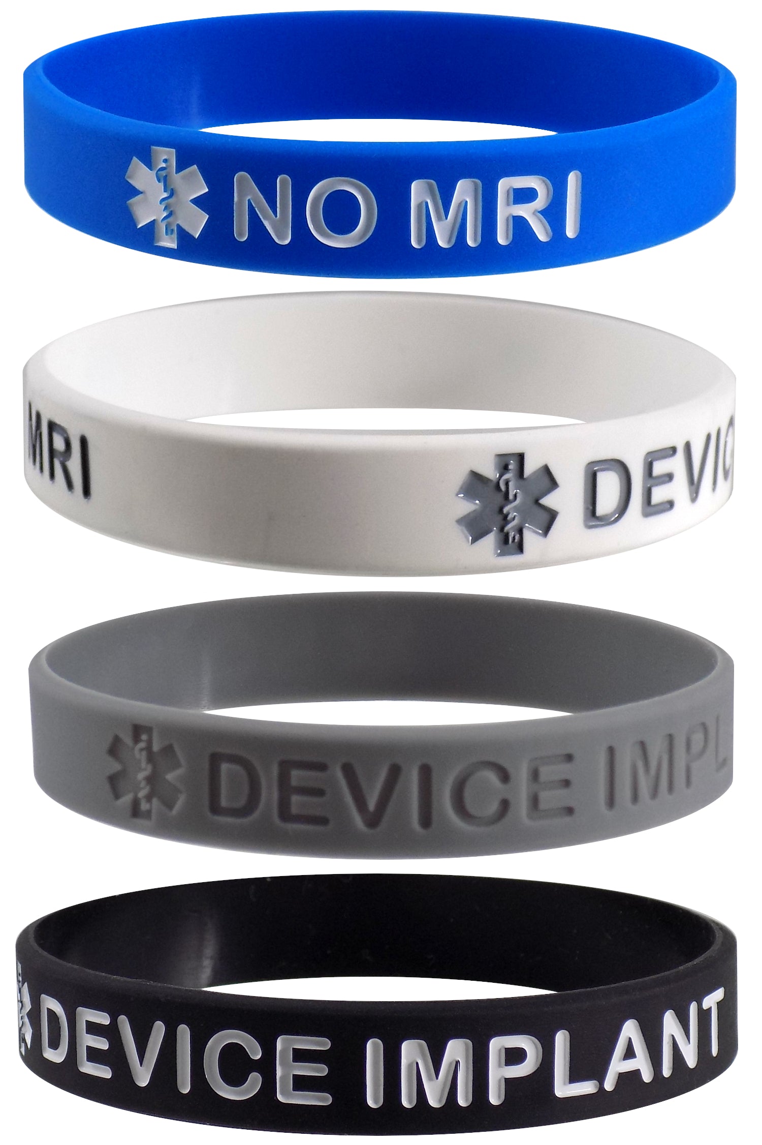'NO MRI DEVICE IMPLANT' Medical Alert ID Silicone Bracelet Wristbands 4 Pack
