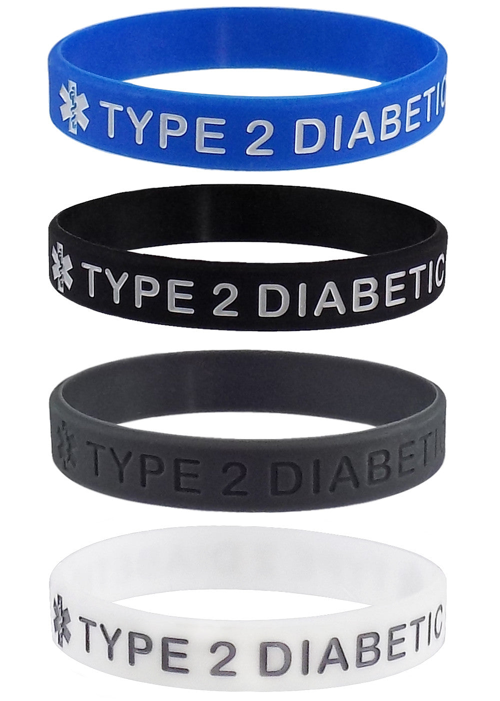 "TYPE 2 DIABETIC" Medical Alert ID Silicone Bracelet Wristbands 4 Pack Black, Blue, Grey and White